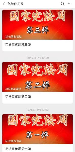 首先,在化学化工系微信公众号上,从12月1--7日,每日推出一篇“宪法知识”美文,组织全席师生认真学习。