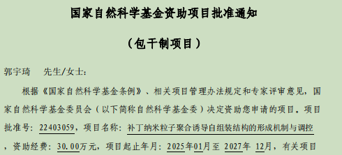 近日,国家自然科学基金委员会公布资助项目评审结果,我系郭宇琦副教授的项目《补丁纳米粒子聚合诱导自组装结构的形成机制与调控》[22403059]荣获国家自然科学基金青年项目资助立项。