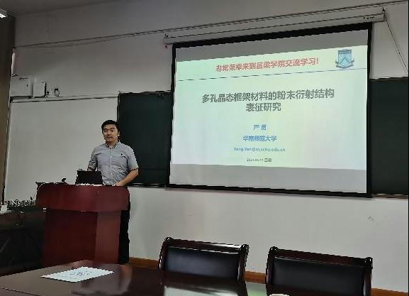 严勇教授主要介绍了多孔晶态材料如金属有机框架(MOFs)和共价有机框架(COFs)在能源存储、分离、催化等方面的潜在应用价值、中子粉末衍射结合X射线粉末衍射方法解析多孔晶体材料的高效性。讲座结束后,在座教师分别就科研方向、讲座内容进行提问,严勇教授、刘江教授为在座教师进行了一一解答。