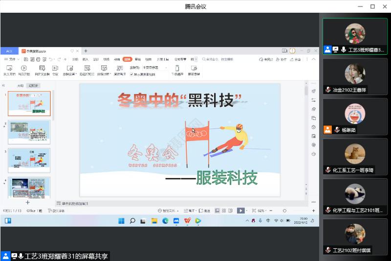 讲座伊始,主持人播放一段“冬奥中的化学黑科技”视频引出本次讲座的主题“化学助冬奥,一起向未来”。接着带领大家了解了2022年北京冬奥会的火炬--“飞扬”、全球疫情肆虐下的科技防疫措施、冬奥会上的服装黑科技服装科技、冬奥会中的制冰技术--二氧化碳跨临界制冰、碲化镉发电玻璃所蕴含的化学知识、冬奥会中的碳纤维复合材料滑雪板,通过这些化学奥秘向同学们传达“科学渗透于生活”的观念,号召同学们关注生活中的化学。最后同学们积极发言,分享自己的所获所感,大家纷纷表示此次活动激发了自己发掘科学知识价值的热情。