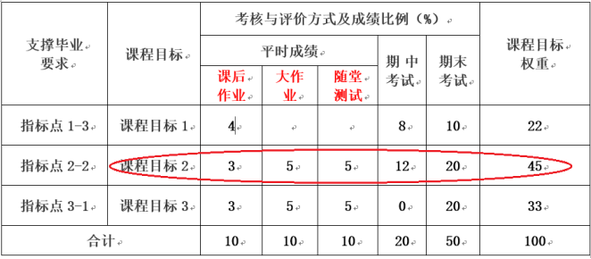 如上表中课程目标2达成情况评价包括5个考核环节:1(课后作业)、2(大作业)、3(随堂测试)、4(期中考试)、5(期末考试)。权重分别为:1(3/45)、2(5/45)、3(5/45)、4(12/45)、5(20/45)。其中: