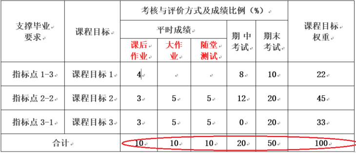 课程目标达成情况评价包括5个考核环节:1(课后作业)、2(大作业)、3(随堂测试)、4(期中考试)、5(期末考试)。5个考核环节设计分值均为100分,权重分别为:1(10/100)、2(10/100)、3(10/100)、4(20/100)、5(50/100)。