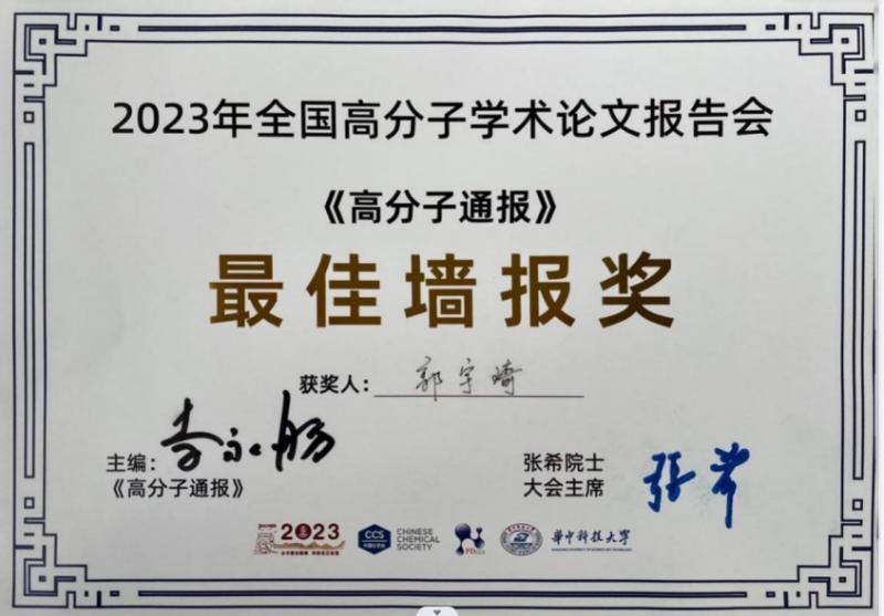 此外,郭宇琦老师在此次会议上展示了题为“Phase transition of asymmetric diblock copolymer and homopolymer hybrid system induced by nanorods”的墙报,该墙报最终获得了“《高分子通报》最佳墙报奖”。