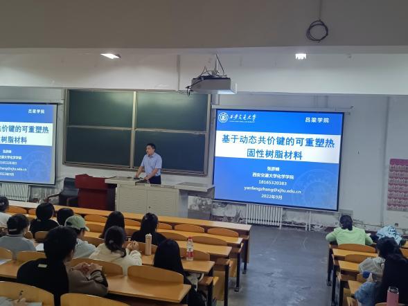 下午,丁书江教授和张彦峰教授在一区教学楼1C101教室分别作了题为“固态锂离子电池”和“基于动态共价键的可重塑热固树脂材料”的学术报告,化学化工系师生代表300余人参加。丁书江教授结合自身的科研经历,从固态锂电池的发展与应用及当前的前沿科技动态进行了讲解。张彦峰教授结合可重塑热固性树脂材料的科研动态,为在座的师生科普了废物利用与先进高分子材料的加工方法。