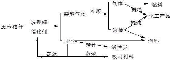 以当地玉米秸秆为原料,在催化剂存在的条件下,经微波裂解仪裂解,裂解产物为气体、液体和固体。玉米秸秆的裂解产率的高低直接影响的本工艺过程的实施,通过微波的波长、裂解温度、催化剂的用量、催化剂的加入方式的探索,优化反应条件,得出最佳裂解方案。